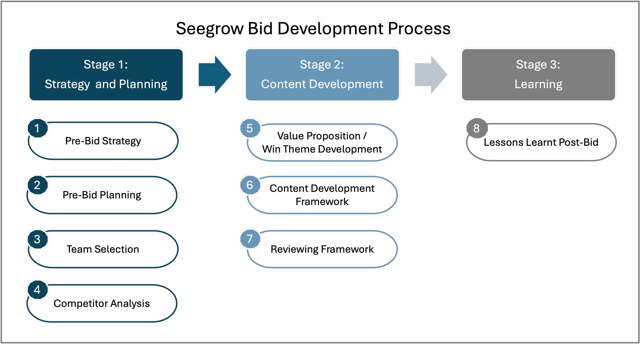 We work differently. We start at the end. We define exactly what it’ll take to win and work backward to a winning submission. Price is just one element. You’re not selling a commodity but a creative, risk-managed solution. Talk to Seegrow and we’ll show you how to not sell yourself short. And how to win more tenders.